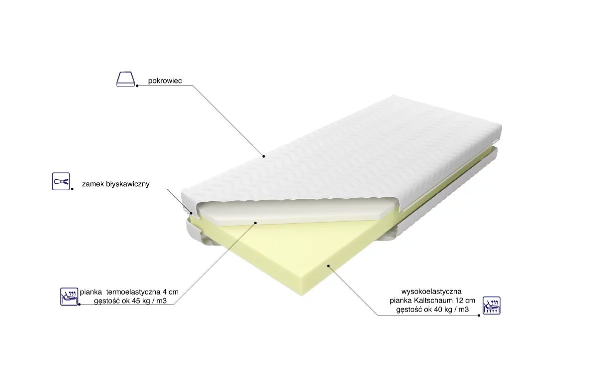 wkład: 12 cm pianki wysokoelastycznej Kaltschaum oraz 4 cm pianki termoelastycznej.