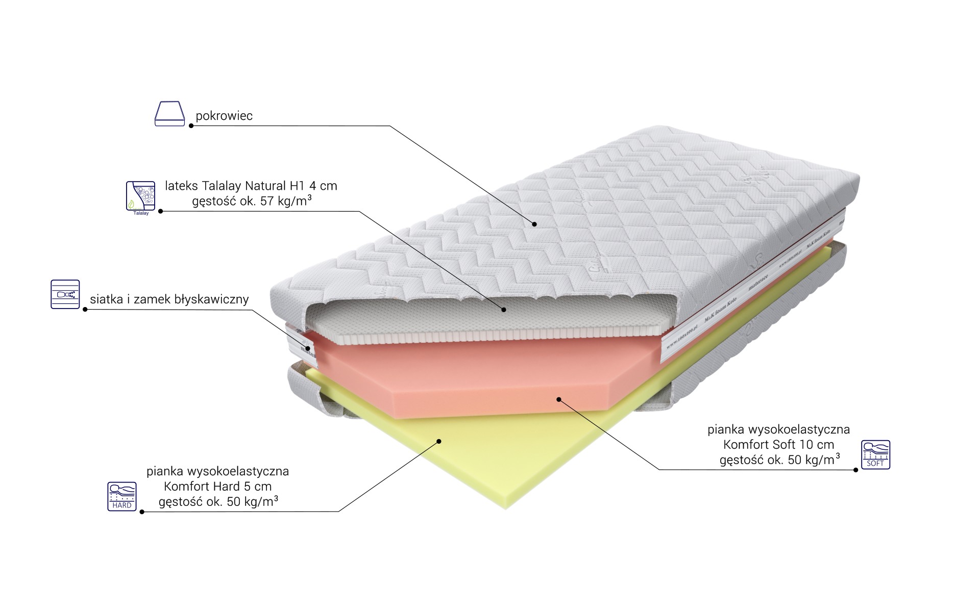 Gęstość warstwy pianki wysokoelastycznej jest w każdej z tych wersji taka sama i wynosi ok. 50 kg/m3. O twardości materaca decyduje wybór zasadniczej warstwy z pianki lateksowej.