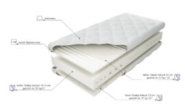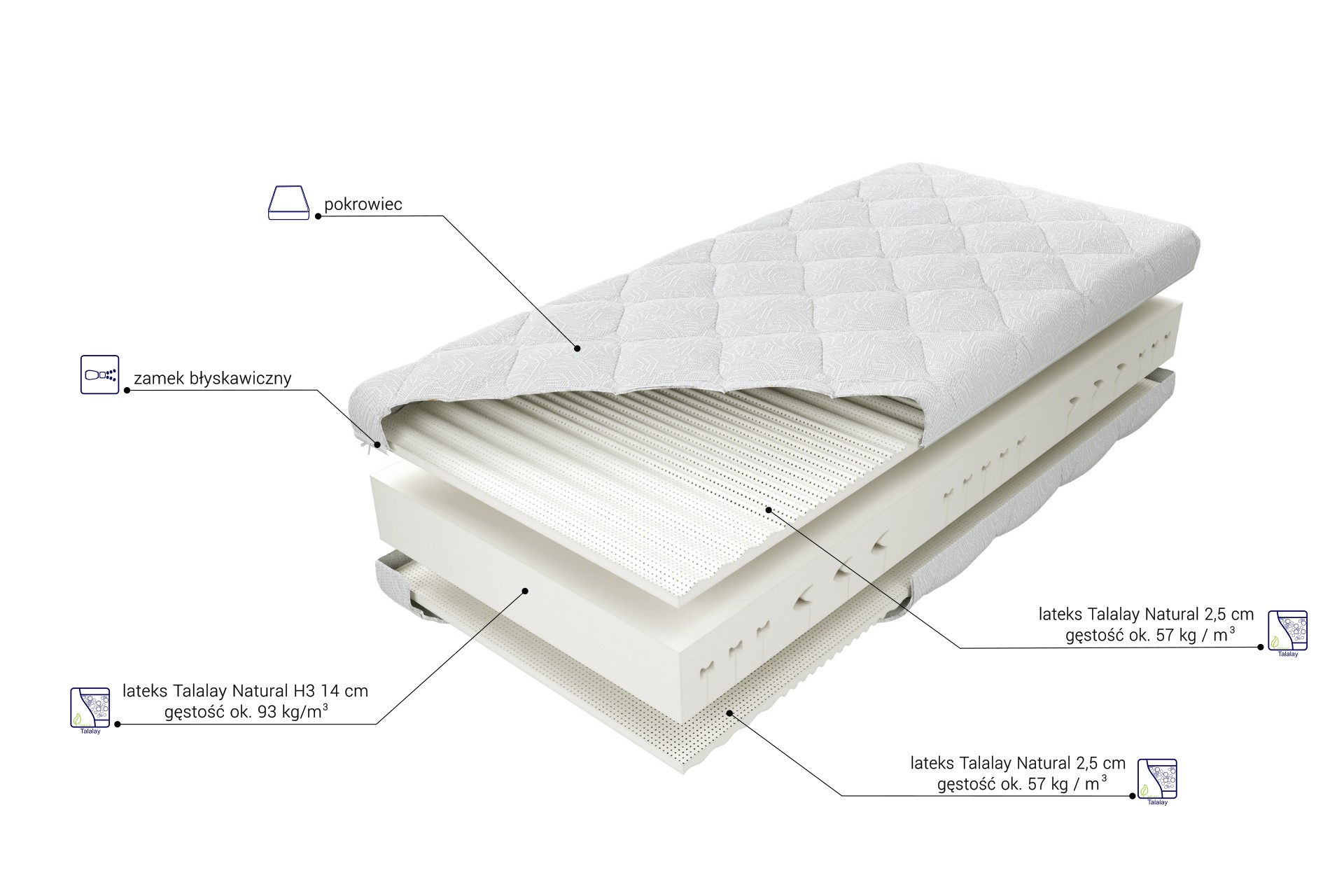 – Budowa – rdzeń materaca – średnio-twardy 14 cm naturalnego lateksu H3 (gęstość 93 kg/m3), obustronnie obłożony 2,5 cm płatami lateksu H1 (gęstość 57 kg/m3).